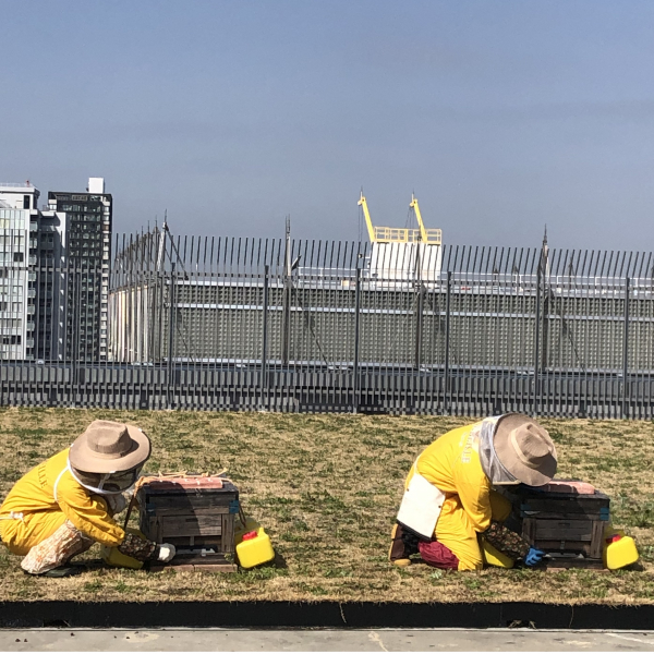 養蜂作業を担当しているのはB1〈ラベイユ〉の養蜂部の方々と大丸社員であり発案者の吉田さん。
